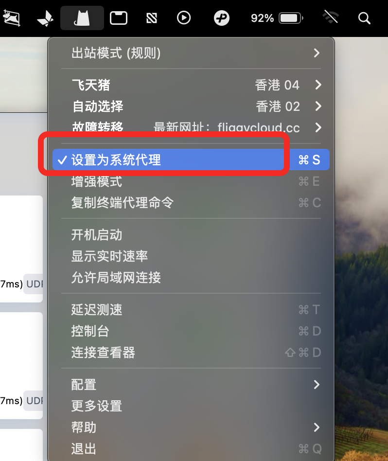 - 点击顶部菜单栏 Clash 图标(小飞机或盾牌)。